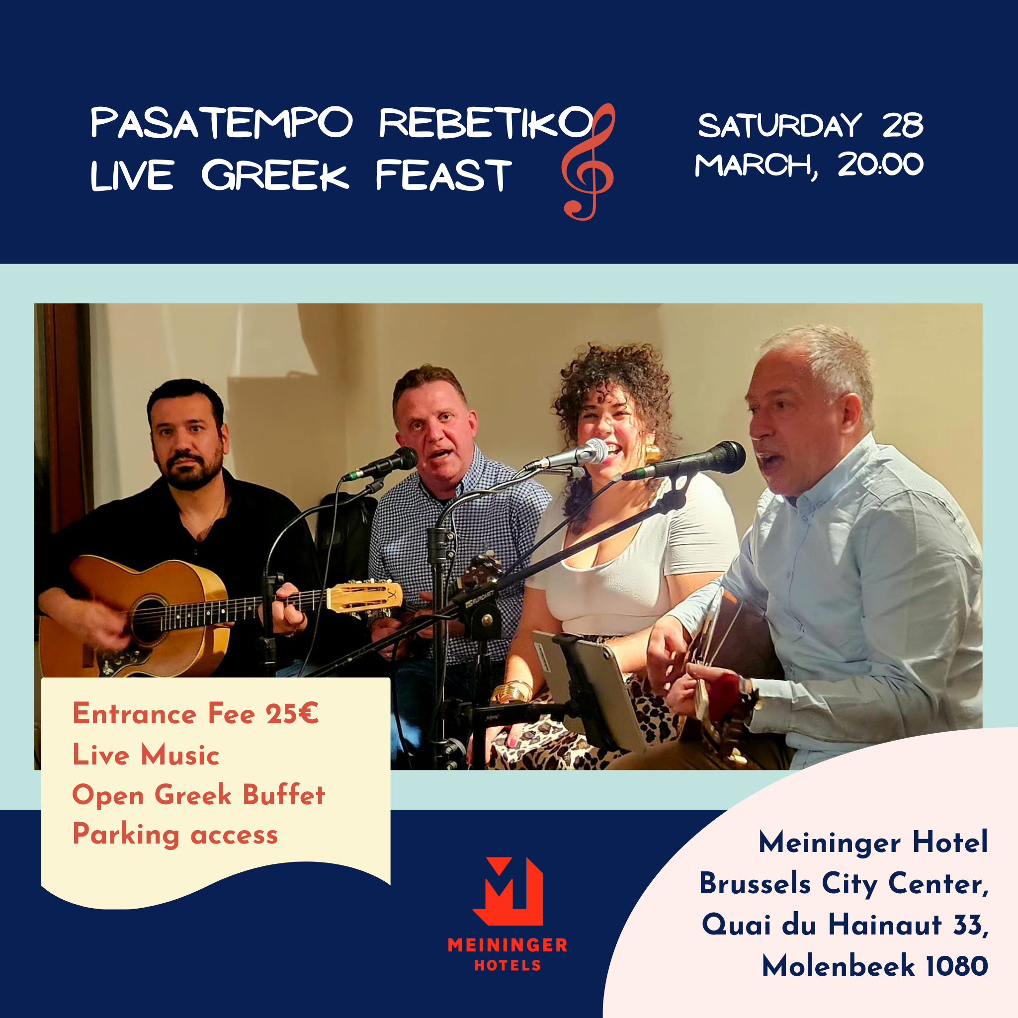 Το ξενοδοχείο Meininger Brussels City Center προσκαλεί τους φίλους της ελληνικής κοινότητας σε μια ρεμπέτικη βραδιά με τους Πασατέμπο, το Σάββατο 28 Μαρτίου στις 8 η ώρα, Quai du Hainaut 33, 1080.